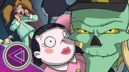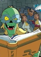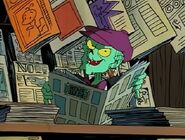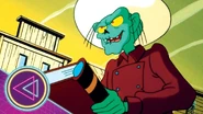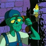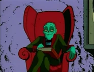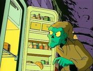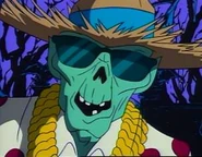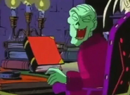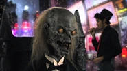 The Crypt Keeper is a short, decaying zombie with pale yellow-brown skin, long gray hair, light blue eyes, and green-yellow teeth. He has two recurring outfits. The first outfit is a black tuxedo with a red bow tie, and the second outfit is a dark red hooded robe with an orange belt, and brown sandals.
